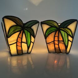 Pair Palm Tree~Tiffany Style Stained Glass Candle Votive Holder Art Nouveau~SEE$95Tacoma, WA