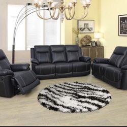 Brand New Black Leather Baseball Stitched 3pc Reclining Set With Storage Compartments A Drop Down Table & Built In Cup Holders $1,275Renton, WA