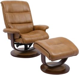 Pemberly Row Leather Manual Reclining Swivel Chair and Ottoman in Brown
