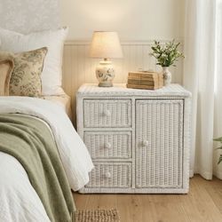 Vintage White Wicker End Table or Night Stand With 3 Drawers and Shelves