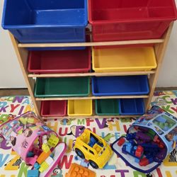 Kids Natural WoodToy Storage Organizer With 10 Primary Color Plastic Bins And - Toys And Playmat$40Bellevue, WA