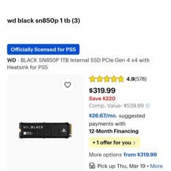WD Black SN850P 1 Tb NVME$225Edmonds, WA