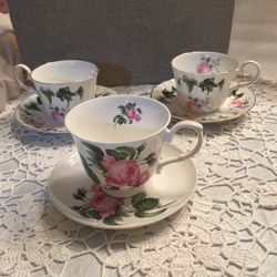 Set of three English Roses bone china teacups and saucers$35Graham, WA