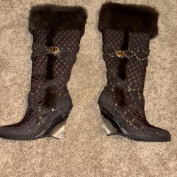 Rare Y2K Black Baby Phat Quilted Boots with a Clear Wedge Heel, faux fur trim, with gold accents super rare deadstock boots$300Lakewood, WA