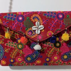Red embroidered clutch bag with colorful pom-poms and cowrie shell$7Redmond, WA
