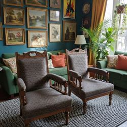A Rare Find: Pair of Late Victorian early Craftsman Upholstered Wood Parlor Library Lounge Chairs.