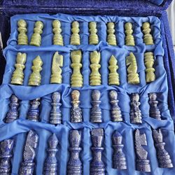 A handcrafted lapis lazuli chessboard featuring pieces made of genuine lapis lazuli and jade Stone $750Lynnwood, WA