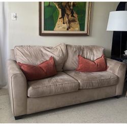 MARTHA STEWART – MACY’S Bradyn Genuine Leather Roll Arm Loveseat with Wooden Bun Feet in Taupe$399Seatac, WA