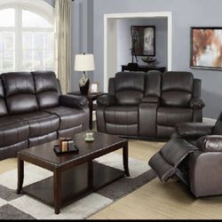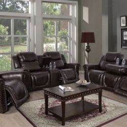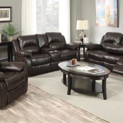 Brand New Brown Leather 3pc Reclining Set With Storage Compartments A Drop Down Table & Built In Cup Holders $1,275Spanaway, WA