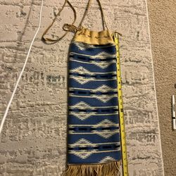 handwoven Southwestern or Navajo-style flatweave wool bag with a leather drawstring and fringe$80Seattle, WA