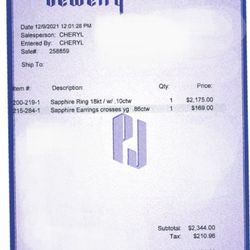 Reciept Of Ring 18 K White Gold With 10CW Brilliant Sapphire $1,000Four Lakes, WA