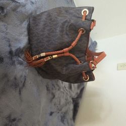 Michael Kors Brown Monogram Drawstring Bucket Bag — Gold Hardware