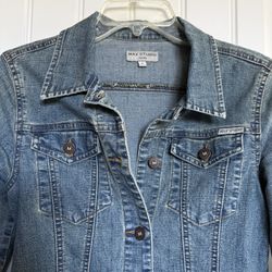 Max Studio denim jacket/brown suede code detail small in excellent condition$8Tacoma, WA
