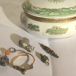 Antique Nippon box with Asian Treasures: Maitreya, Tibetan Amulets, Cambodian Silver Elephant, Etruscan Gold filled bracelet$395Seattle, WA