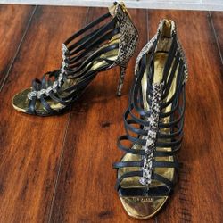 Ted Baker Black Strappy Heels EU 38 US 7.5 Snake Print Gold Toe Stiletto Sandals$55Mukilteo, WA