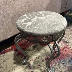 Metal vanity stool featuring an ornate, pierced lattice or filigree base and a cushioned, upholstered top. $55Seatac, WA