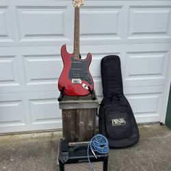 Beautiful cherry, red Fender Squier Stratocaster, guitar, amp, case, strap, cord package all in good condition and working. $200Vancouver, WA