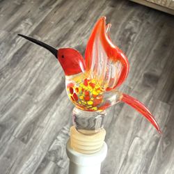 Beautiful Handblown Glass Hummingbird Bottle Stopper. Red, yellow glass, clear with dark beak. Has a rubber stopper for a tight seal. About 5 inches $16Tacoma, WA