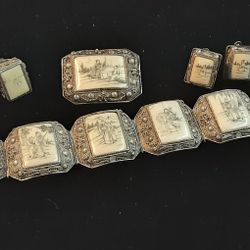 Vintage Chinese Silver Fillgree Faux Ivory Scrimshaw Jewelry Set- Located In Shelton $235Skok, WA