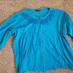 Womens 2XL Notations teal 3/4 sleeve cardigan with fluff around neck Lot 11$3Janesville, WI