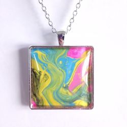 Multicolored acrylic paint pour square pendant on 20" inch silver necklace$13Princeton, WV