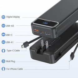 20000mAh Lightweight-Portable-Charger-Power-Bank with Built-in Cables and AC Wall Plug, PD20W USB-C Fast Charging Battery Pack, LED Display $39Fresno, CA