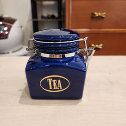 Ceramic Tea Caddy, airtight blue and gold ceramic canister 4" high w rubber seal and clasp hinge- great storage and decor in any room, good condition$5Parker, CO