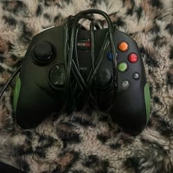 The image features an original Microsoft Xbox "Duke" controller and a smaller Nikko-branded controller$20Bethel, CT