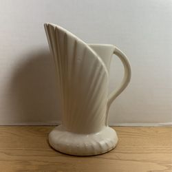 Art Deco Shell Fan Pitcher Vase w Handle Vintage White Ceramic Pottery 7" LR $16West Cornwall, CT