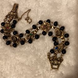 Vintage 7” Solid Goldtone Bracelet With Black Beads,rhinestones,pearls,& Safety chain $25New Haven, CT