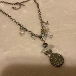18” Vintage Stainless Steel( SilverTone) Chain Necklace With Dangling Pearls,crystals,& Old Fashion Button Pendant,by Grandmothers BUTTONS$20New Haven, CT