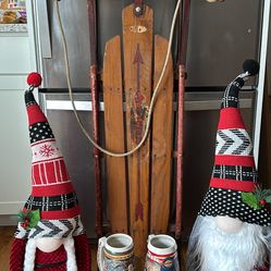 Christmas decor 2 weighted, Xmas gnomes. vintage sled, Budweiser, mugs, tea, light holder all $15$15Bridgeport, CT