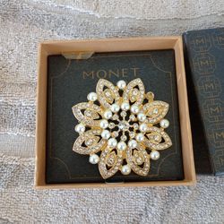MONET FAUX PEARL RHINESTONE GOLD TONE STARBURST BROOCH PIN SIGNED $20Frostproof, FL