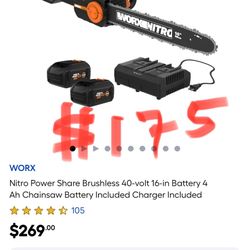 WORX Nitro Power Share Brushless 40-volt 16-in Battery 4 Ah Chainsaw Battery Included Charger Included$175Carson, CA