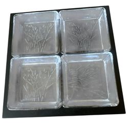 Plastic Relish Tray glass individual are 3x3” and the tray is 8”x8”with etch glass designs on wood base. T-411$18Orange, CA