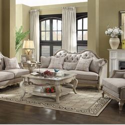 Sofa and Loveseat CHELMSFORD Beige fabric, Antique taupe finish, New Especial price$2,999Santa Ana, CA