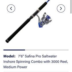 BRAND NEW WITH TAGS!!! 7'6" Safina Pro Saltwater Inshore Spinning Combo with 3000 Reel, Medium Power$65Santa Ana, CA