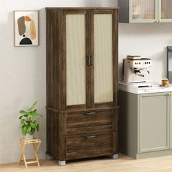 New 64" kitchen Pantry Cabinet with Rattan Doors and 2 Drawers, Freestanding Tall Storage Cabinet with Wine Rack Rattan Pantry Brown New in box SHX15$140La Mirada, CA