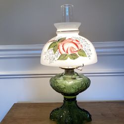 Dark green glass “ Princess Feather “ oil lamp font(made into lamp) w/white HANDPAINTED 10” student shade/ “Queen Elizabeth “ roses (shade similar to $100Lexington, KY