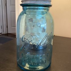 Vintage blue Ball Perfect Mason jar with zinc milk-glass lid. (some chips around the inside Of Jar)$7Lexington, KY