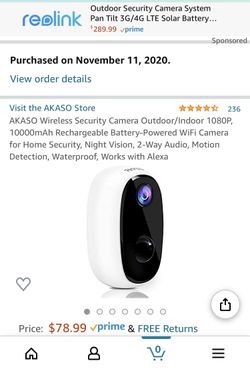 AKASO Wireless Security Camera Outdoor/Indoor 1080P, 10000mAh Rechargeable Battery-Powered WiFi Camera for Home Security, Night Vision, 2-Way Audio,$60Boston, MA