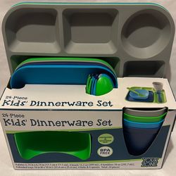 24 Piece Plastic Dinnerware Set for Kids with 4 each Trays, Bowls, Plates, Cups, Forks, Spoons in Bright Green, Teal, Gray, Navy$10Worcester, MA