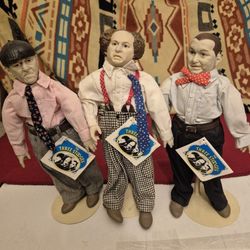 THREE STOOGES UNUSED VINTAGE COLLECTION/ 3 DOLLS MOE, LARRY & CURLY WITH DOLL STANDS/ PLATE WITH CONTAINER/3 GOLF BALLS, SHOT GLASS, 3 DAUBERS/2 PICTU$400Weymouth, MA