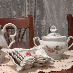 Teapot, Creamer, Sugar Bowl with Lid, Stacked Butterfly Shaped Dishes all In Rose Pattern $100Trenton, NJ