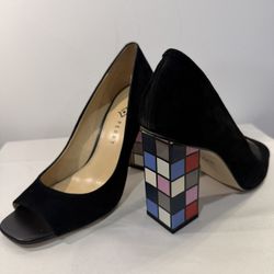 Women’s Katy Perry The Black Suede Caitlin Rubiks Cube Open Toe Heels Size 10$59Brick Township, NJ