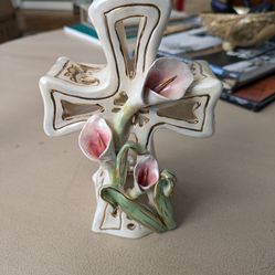 Blue Sky Calla Lily Cross Candle Holder, Heather Goldminc 2002, Porcelain Tealight Luminary