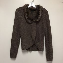 Women’s RELATIVITY Cotton/Acrylic/Polyester/Metallic Brown Long Sleeve 1 Snap Cardigan With Faux Fur Collar… Petite Large$8Pt Pleas Bch, NJ