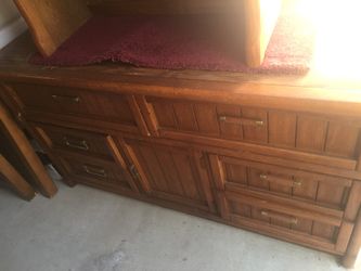 Solid pecan chest, head and foot board and bookcase.. very good condition solid wood —no composition wood.$75Howell, NJ