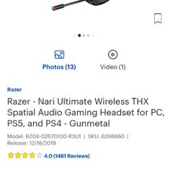 Razer Nari Ultimate Wireless Gameing Headset Only Can Be Used With Wire$150Barnegat, NJ