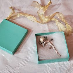 Vintage Charel Long Stem Rose Pin Brooch White Pearl & stones Flower new in box.